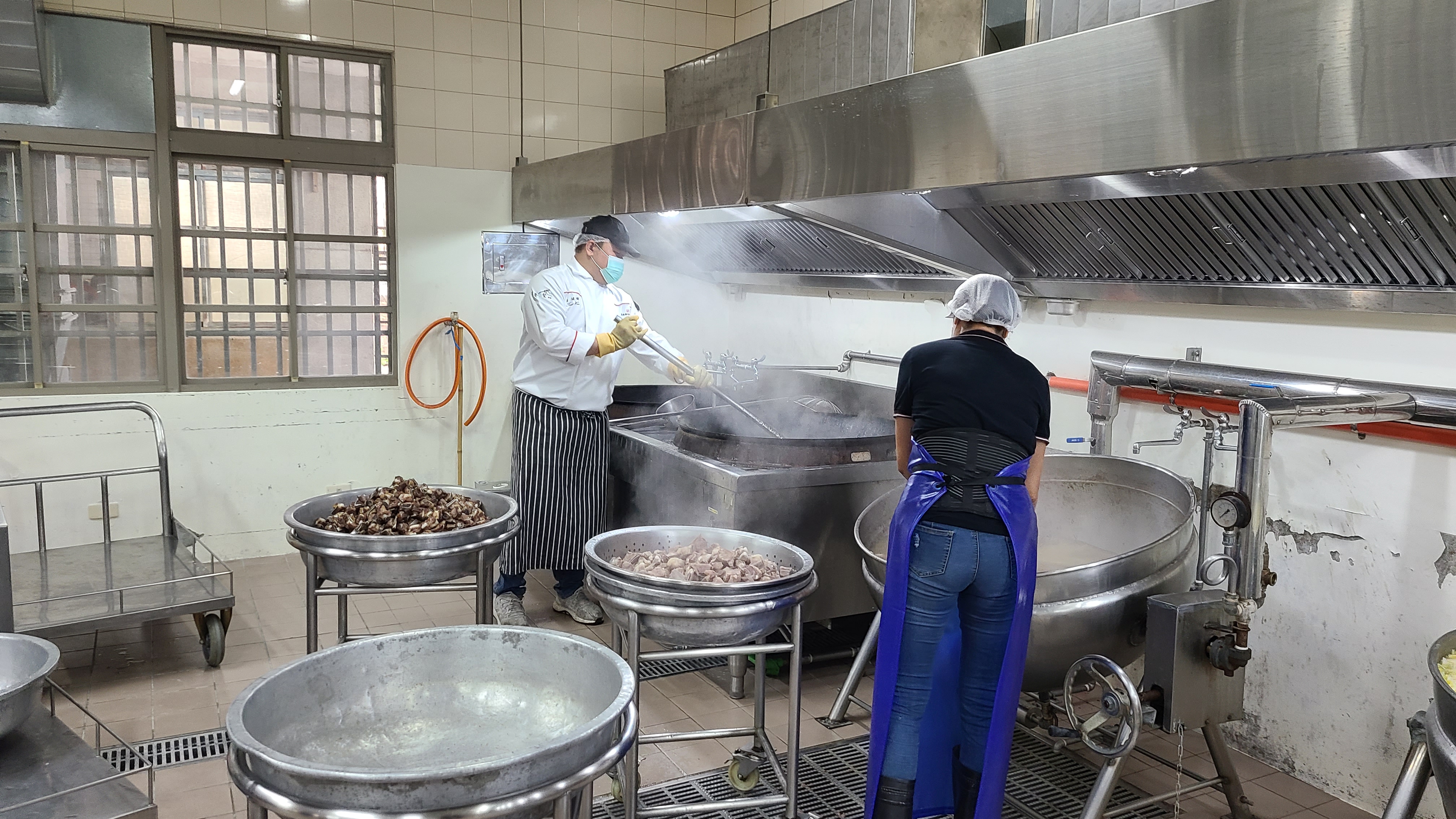 作為灃食主廚,徐健瑜去過台南兩所學校、新北一所學校,前者是鄰近幾個學校共同設一個中央廚房,所以是六、七人要一口氣負責1,000多人份餐點;後者是兩名校廚一個中午要煮300多餐。想想看,這些年紀並不輕的校廚們,常常是早上六點多開始忙,中午11 點就要準備好餐點,加上營養午餐有嚴格的食安要求,不能像外面餐廳一樣提前一天備料,所有食材都是當天早上才處理,校廚們與時間、與數量賽跑,徐健瑜說:「因此他們的觀念是,有熟就好。」